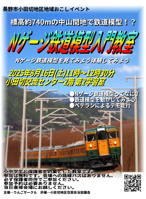 2025年8月16日(土)に小田切交流センター2階 第2学習室で「Nゲージ鉄道模型入門教室」を開催いたします。