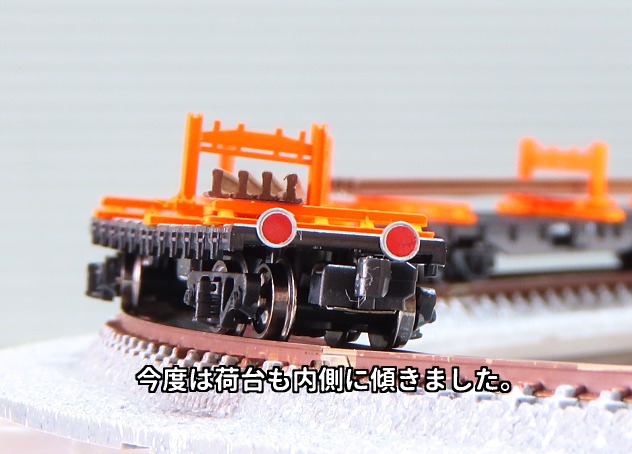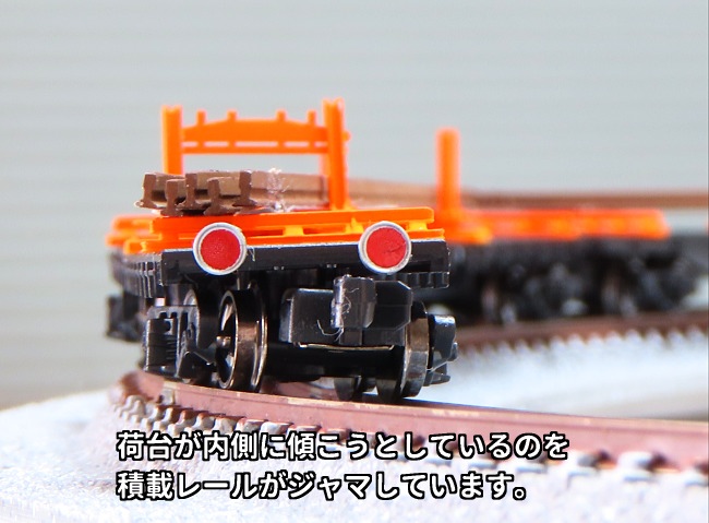 カント付き線路では車体が内側に傾きますが、その傾こうとしているのを積載レールがジャマをして荷台が水平になろうとするのです。