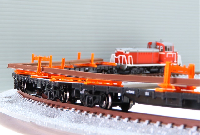 少し前にTOMIXのチキ7000とパンケーキコンテナ社のレール緊締装置を使って製作したレール運搬チキチキ列車。