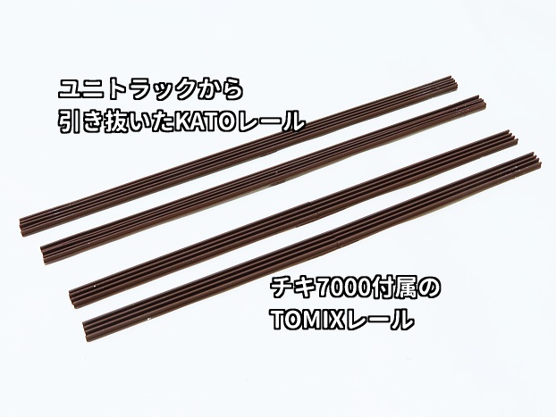 ユニトラックS186から引き抜いたKATOレールとチキ7000に付属してきたTOMIXレールです。