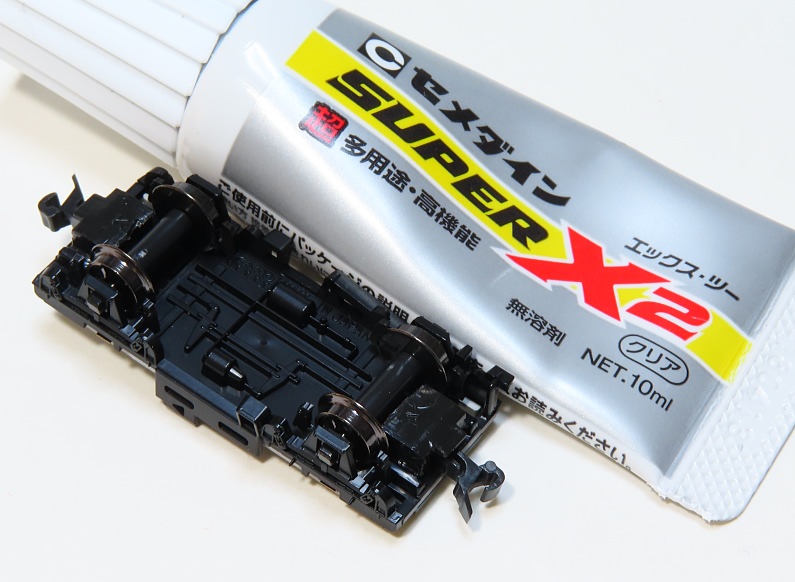 接着面が小さく、普通のゴム系接着剤では強度が不足する可能性がありますので、セメダイン スーパーX2を使用しました。