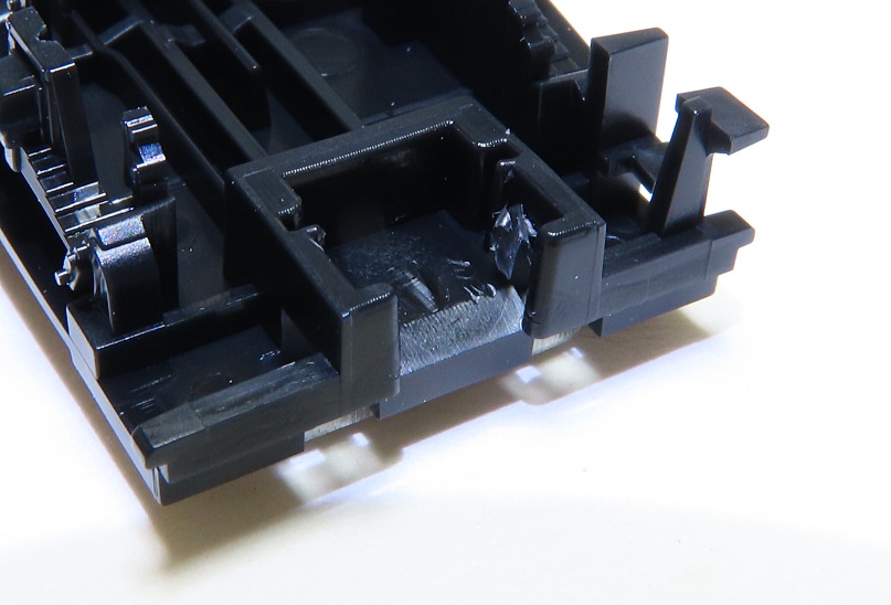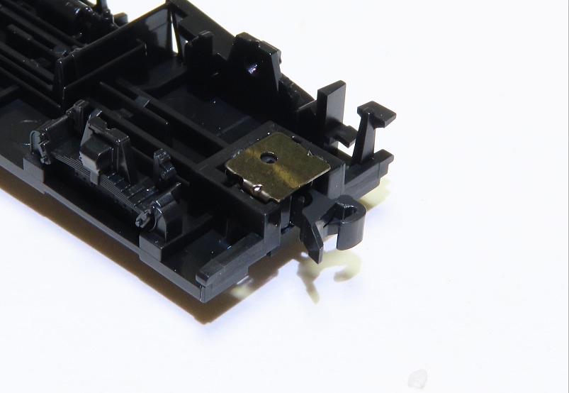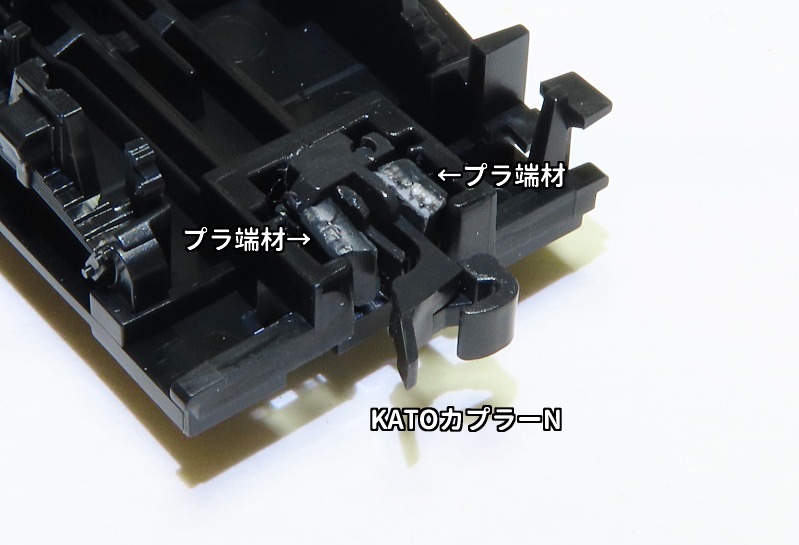 カプラーポケットにKATOカプラーNを置き、両サイドをプラ端材で挟んで抜け出しを防止します。