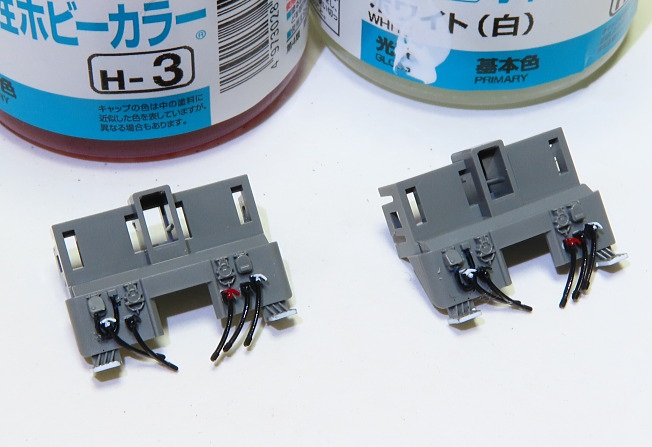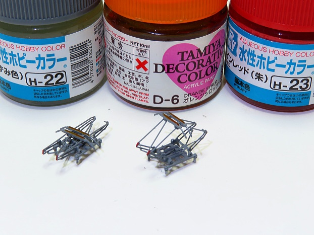 パンタグラフをクレオスH-22ねずみ色で塗装し、スリ板にタミヤD-6オレンジシロップを、ヒンジにクレオスH23シャインレッドを色差しします。