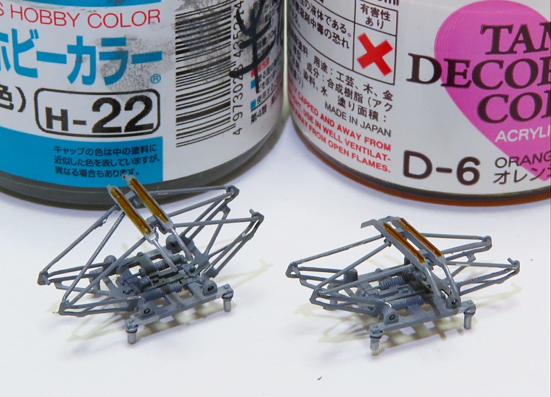 パンタグラフをH-22ねずみ色で塗装し、スリ板にD-6オレンジシロップを色差しします。