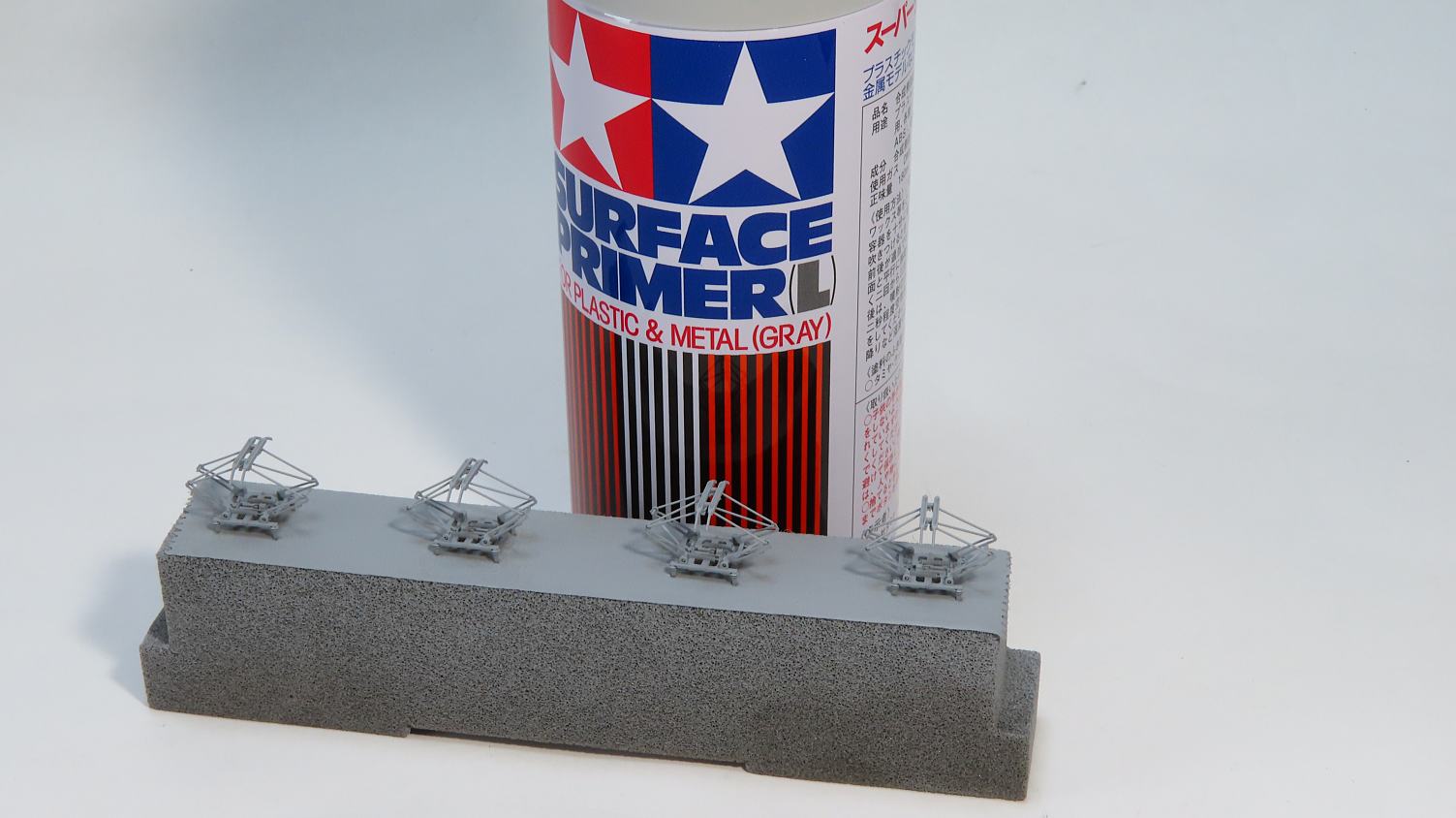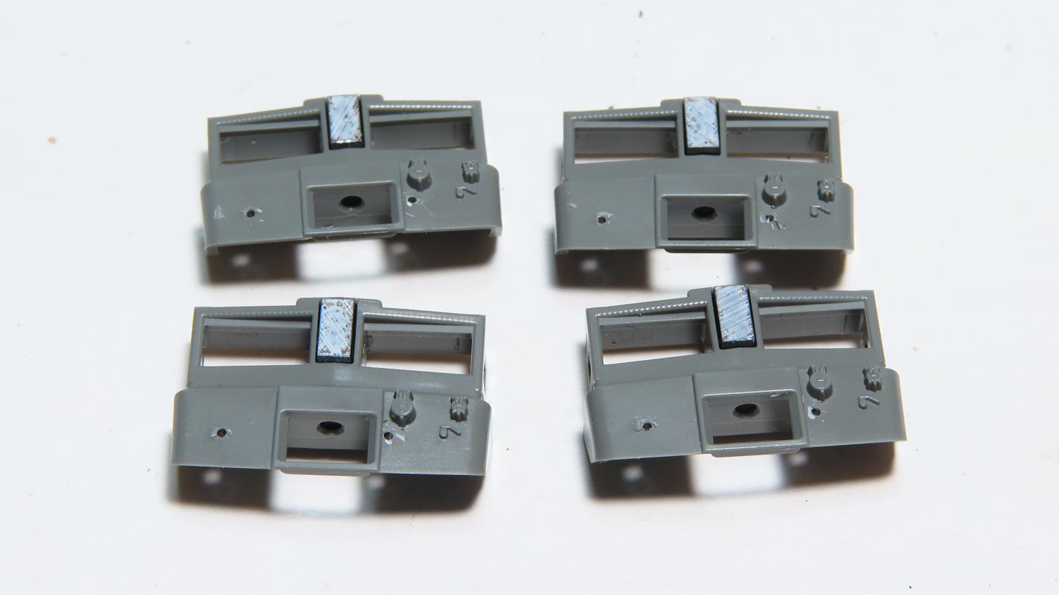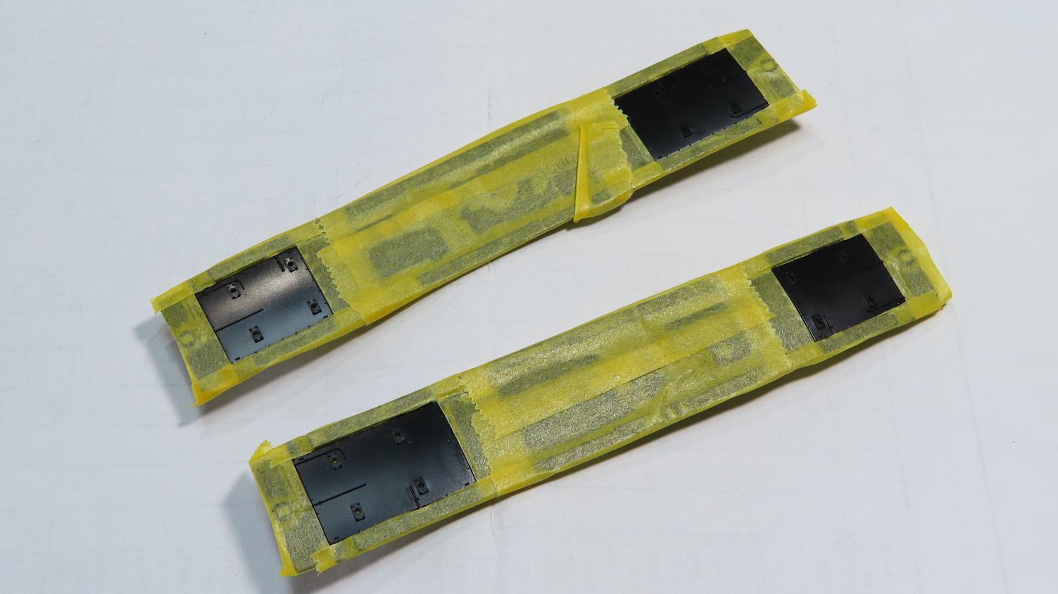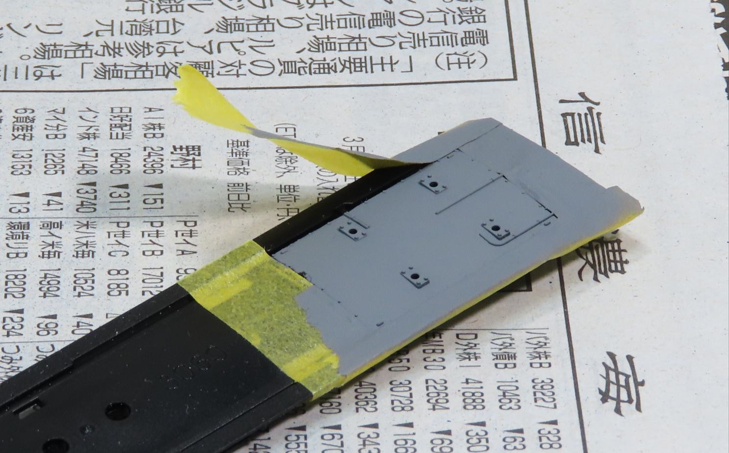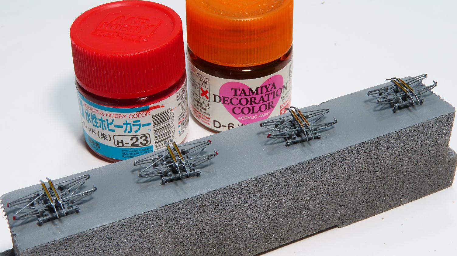 H-22ねずみ色(半光沢に調色)で塗装し、スリ板にD-6オレンジシロップを、前部ヒンジにH-23シャシンレッドを色差しです。