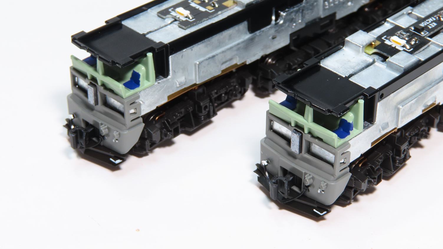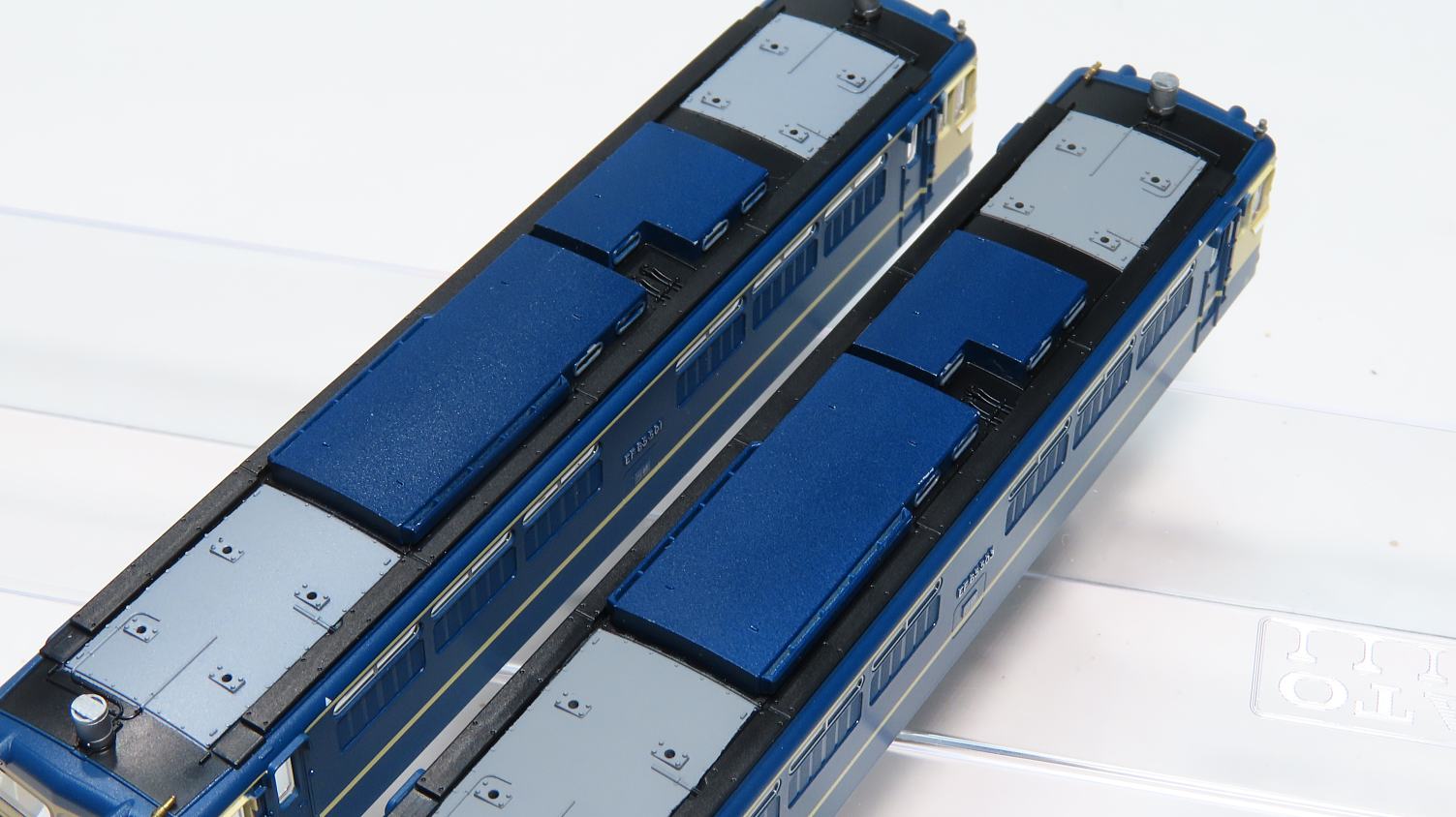 製品の屋根上モニターは黒色になっていますが鉄道雑誌に掲載されている写真やネットに公開されている写真を調べると青色のものもあります。