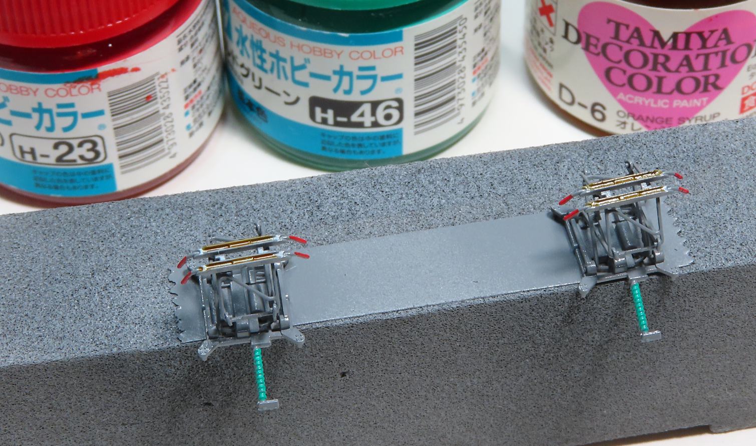 スリ板をD-6オレンジシロップ・碍子をH-46エメラルドグリーン・ホーン先端をH-23シャインレッドで色差し。