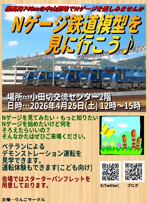 こども向けミニイベント開催 こども向けミニイベント「Nゲージ鉄道模型を見に行こう♪」を開催いたします。 これからNゲージを始めたいけどよくわからない、走っているNゲージを見てみたい… そんな小中学生向けのイベントです。 どうぞご来場ください。 2026年4月25日(土) 12時~15時 小田切交流センター2階 ※長野中心市街地と会場(川後)を結んでいた路線バスは廃止となり今は公共交通がありません。 自家用車でご来場ください。 駐車場は約20台ぶんあります。 PR こども向けイベントはお休み中です。 12月と1月に開催したこども向けイベント「Nゲージ鉄道模型を見に行こう♪」は冬季休会中です。 再開するときはこのブログでお知らせいたします。 小中学生向けNゲージ見学会開催 12月に開催しました、小中学生向けミニイベント「Nゲージ鉄道模型を見に行こう」を1月も開催いたします。 Nゲージを見てみたい、もっと知りたいというかたはどうぞお越しください。 2026年1月31日(土) 12時~15時 小田切交流センター2階 第2学習室 2015年12月のようす。 KATO木造機関庫 KATOのストラクチャー「木造機関庫」を導入しました。 昔からある製品ですが先日導入したKATO京都駅店特製D51 96長野機関区にあわせて蒸気機関車に似合う機関庫が所望となり購入です。 つづきはこちら TOMIX EF210 300番台新鶴見機関区 TOMIX EF210 300番台新鶴見機関区を導入しました。 EF210はKATOで統一したいので2025年の新発売当時はスルーしていました。 しかし、KATOから300番台新鶴見機関区が通常品として発売される見込みがないので今になってTOMIXに手を出してしまいました(^^; つづきはこちら