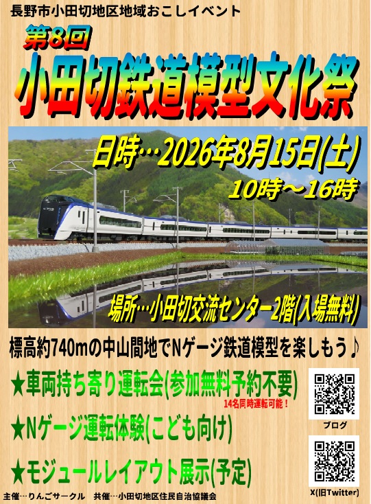 第8回 小田切鉄道模型文化祭 開催 今年も小田切鉄道模型文化祭を開催いたします。 日時…2026年8月15日(土) 時間…10時~16時 場所…小田切交流センター2階(入場無料) つづきはこちら PR こども向けミニイベント開催 こども向けミニイベント「Nゲージ鉄道模型を見に行こう♪」を開催いたします。 これからNゲージを始めたいけどよくわからない、走っているNゲージを見てみたい… そんな小中学生向けのイベントです。 どうぞご来場ください。 2026年4月25日(土) 12時~15時 小田切交流センター2階 ※長野中心市街地と会場(川後)を結んでいた路線バスは廃止となり今は公共交通がありません。 自家用車でご来場ください。 駐車場は約20台ぶんあります。 こども向けイベントはお休み中です。 12月と1月に開催したこども向けイベント「Nゲージ鉄道模型を見に行こう♪」は冬季休会中です。 再開するときはこのブログでお知らせいたします。 小中学生向けNゲージ見学会開催 12月に開催しました、小中学生向けミニイベント「Nゲージ鉄道模型を見に行こう」を1月も開催いたします。 Nゲージを見てみたい、もっと知りたいというかたはどうぞお越しください。 2026年1月31日(土) 12時~15時 小田切交流センター2階 第2学習室 2015年12月のようす。 KATO木造機関庫 KATOのストラクチャー「木造機関庫」を導入しました。 昔からある製品ですが先日導入したKATO京都駅店特製D51 96長野機関区にあわせて蒸気機関車に似合う機関庫が所望となり購入です。 つづきはこちら