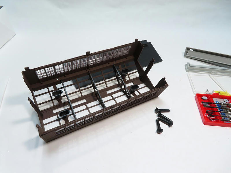 建屋と梁はクレオスH-84マホガニーで塗装。